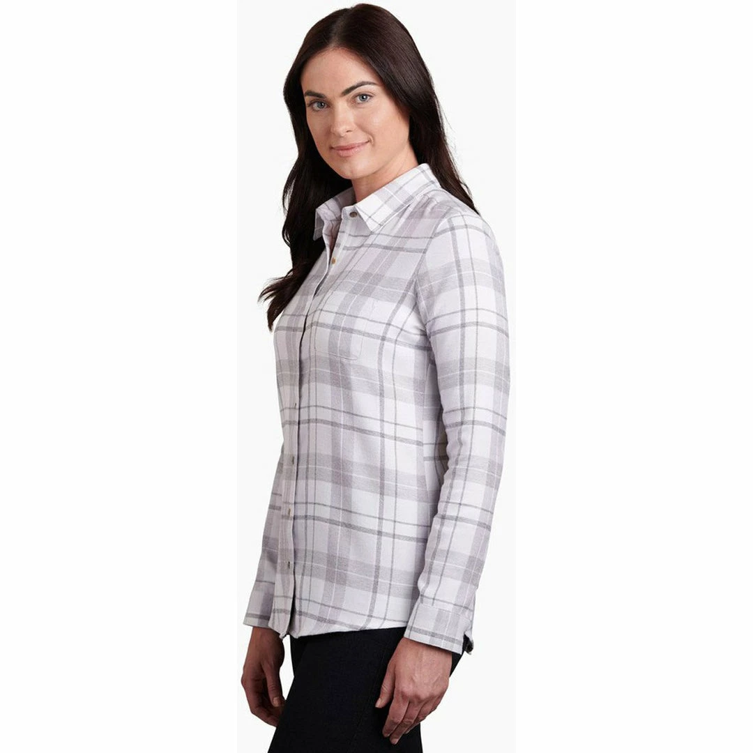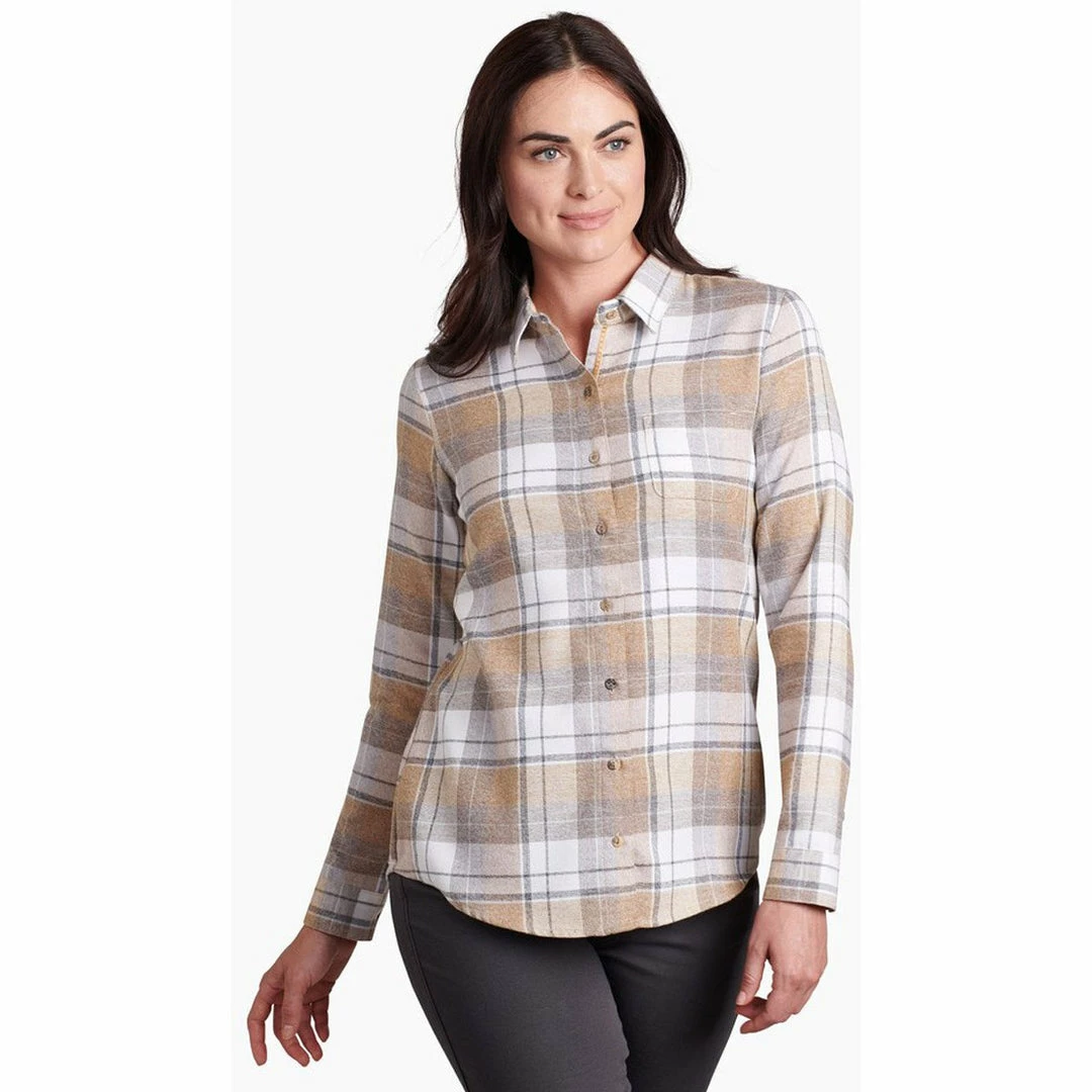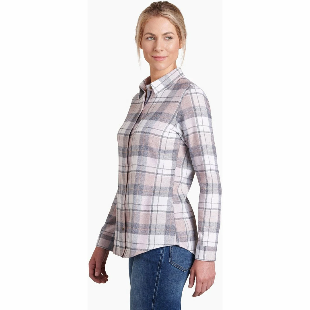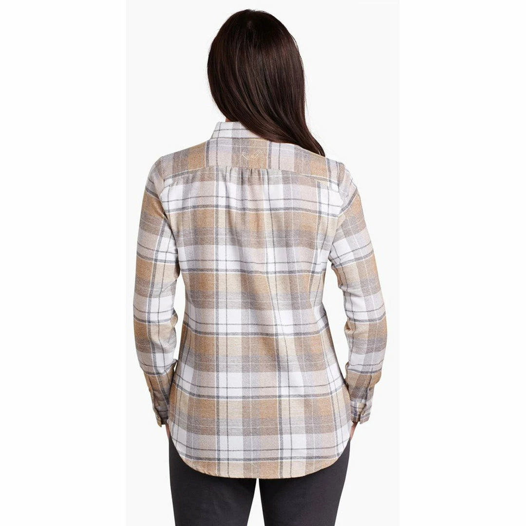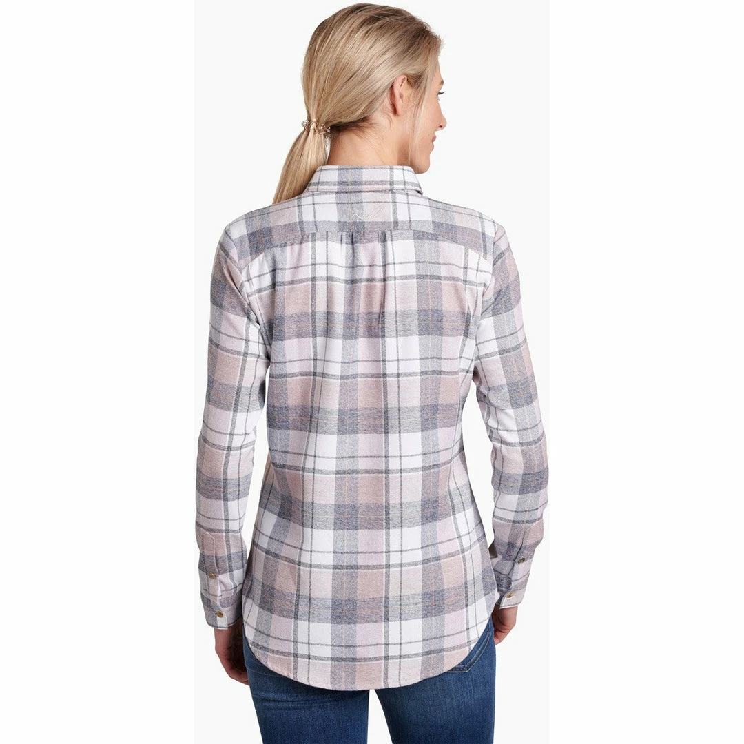 The KÜHL KAMILA FLANNEL is vintage-inspired for a look unlike any other. Brushed fabric on both sides creates a cozy feel. With a curved, dropped back hem, the KAMILA FLANNEL is feminine and flattering. Boasting rich colors and velvet detail on the placket, the KAMILA FLANNEL is perfect for a simple, stylish transition to fall.
