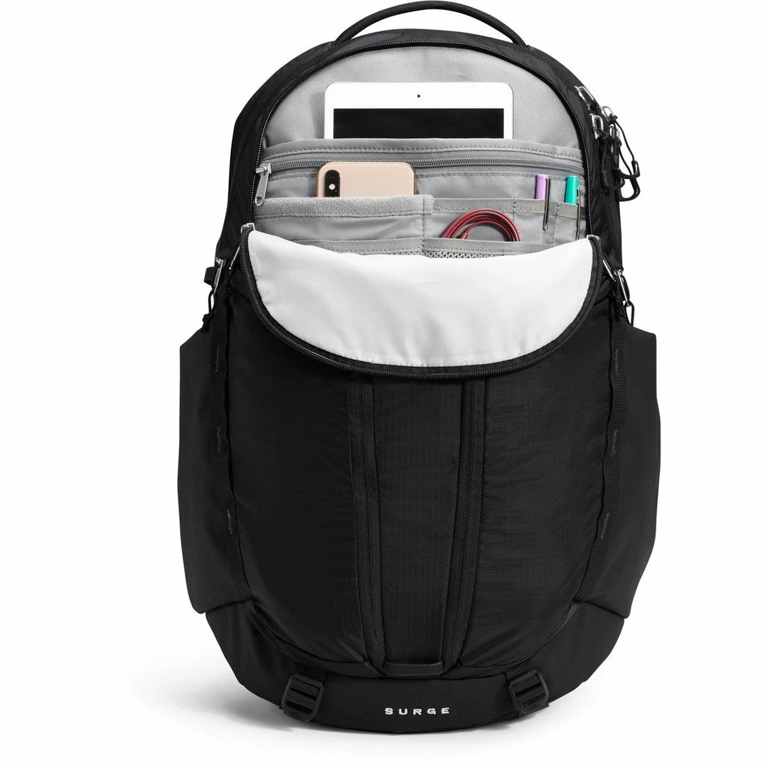 - Front compartment has internal organization with secure-zip pockets and a padded tablet sleeve